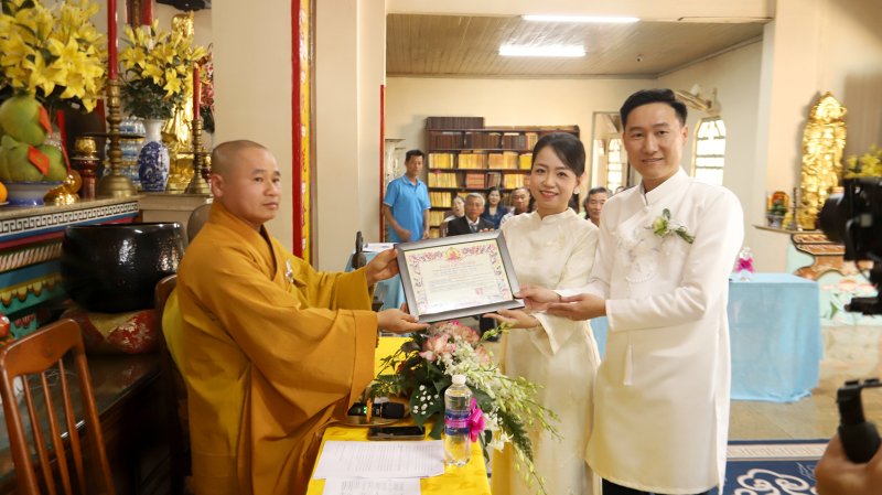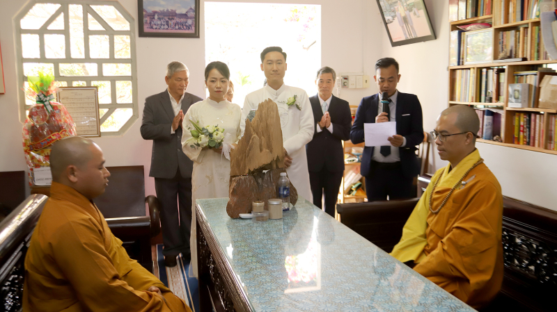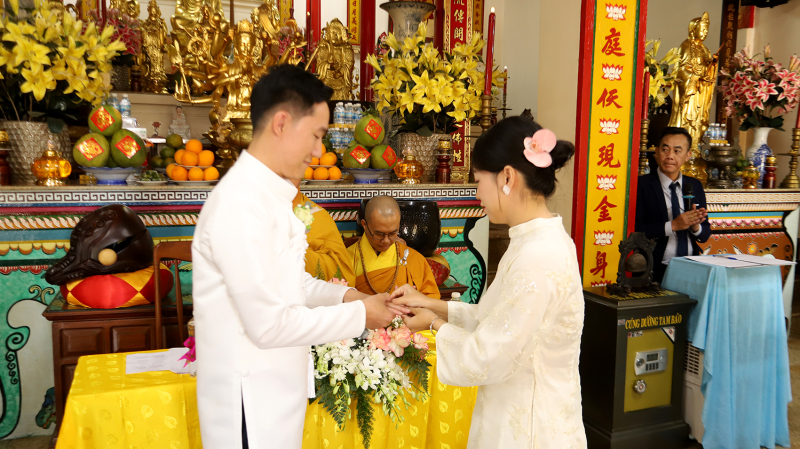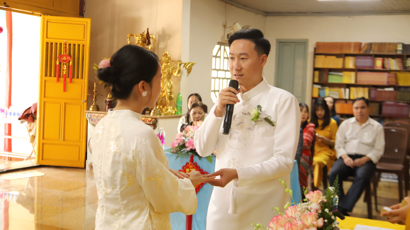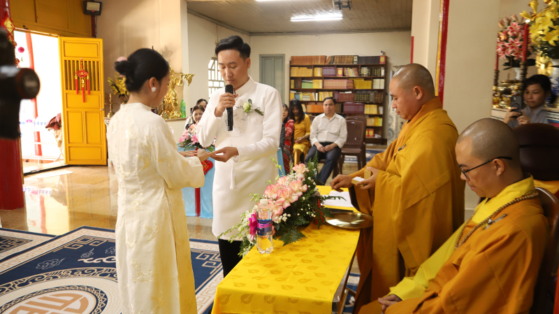 Dưới sự chứng minh của mười phương chư Phật và sự hiện diện của hai bên gia đình, đôi bạn trẻ đã thực hiện nghi thức trao nhẫn cưới. Chiếc nhẫn tròn biểu tượng cho sự gắn kết không có điểm dừng, nhắc nhở đôi vợ chồng về sự nhẫn nhịn và lòng thủy chung. Tiếp đó, tân lang và tân nương đã dâng lời phát nguyện giữ gìn năm giới, thực hiện đúng bổn phận vợ chồng và lòng hiếu thảo đối với cha mẹ hai bên.